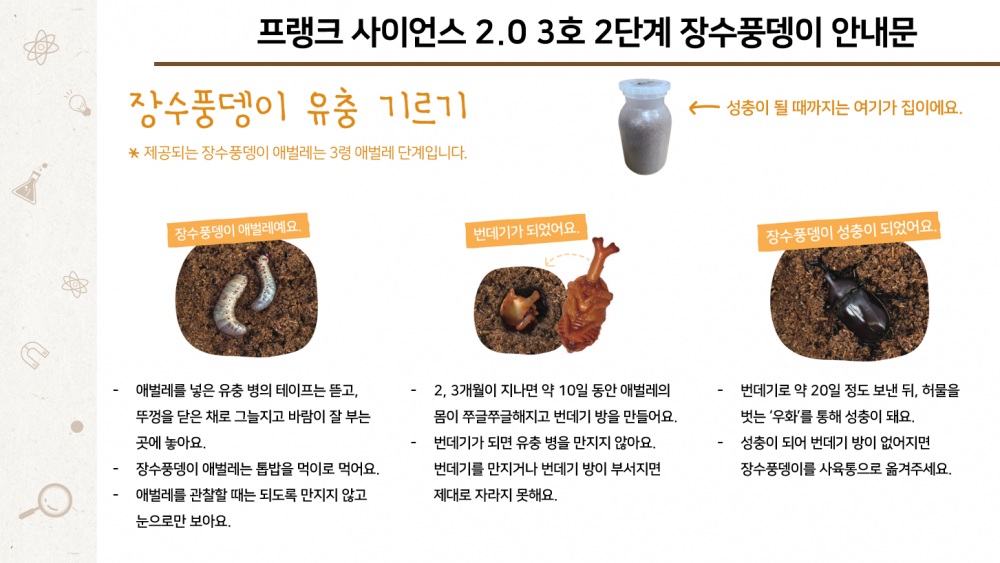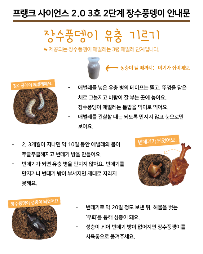 프랭크 사이언스 2.0 3호 2단계 장수풍뎅이 안내 페이지 정보 작성자 아이온 댓글 0건 조회 3,844회 작성일 23-04-28 16:51 본문 안녕하세요. 아이온에듀 X 레몬에듀입니다.프랭크 사이언스 2.0 3호 2단계에는 장수풍뎅이가 제공됩니다.키우실 참고하실 수 있도록 생태 안내문을 제공하오니 참고 부탁드립니다.- 프랭크 사이언스 2.0 > 공지사항에도 확인하실 수 있습니다.감사합니다. 목록 이전글누리나래 그림나래 콘테스트 입상자 발표 23.06.12 다음글2023 그림나래 콘테스트 안내 23.04.18 댓글목록 댓글목록 등록된 댓글이 없습니다.