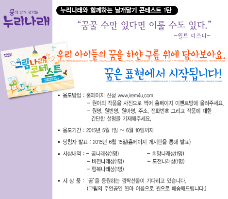 누리나래 그림나래 콘테스트 공지 페이지 정보 작성자 아이렘 댓글 0건 조회 4,033회 본문 누리나래의 첫 번째 이벤트인 "그림나래 콘테스트"입니다.선생님들의 많은 참여 부탁드립니다. 검색 목록 이전글자연 생태교육 프로젝트 연간 주제 안내 15.05.06 다음글누리나래 3호 어버이날을 위한 부모님 선물 교구 안내문 15.04.30 댓글목록 댓글 등록 시, 로그인이 필요합니다. 로그인 댓글목록 등록된 댓글이 없습니다.