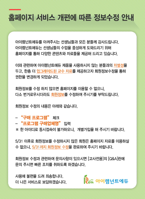 누리나래 홈페이지 서비스 개편에 따른 정보수정 안내 페이지 정보 작성자 아이렘 댓글 0건 조회 4,200회 본문 검색 목록 이전글3호 1단계 궁금한 나의 몸 교구 활용 안내 15.05.11 다음글자연 생태교육 프로젝트 연간 주제 안내 15.05.06 댓글목록 댓글 등록 시, 로그인이 필요합니다. 로그인 댓글목록 등록된 댓글이 없습니다.