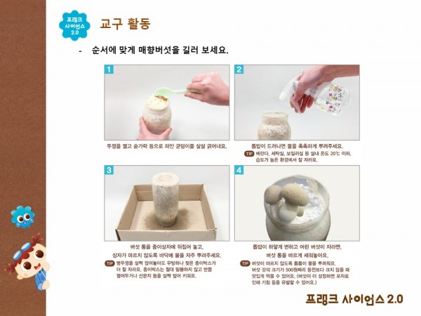 프랭크사이언스2.0 프랭크 사이언스 2.0 생태교구 안내문 (장수풍뎅이, 달팽이, 강낭콩, 매향버섯, 개운죽) 페이지 정보 작성자 아이온 댓글 0건 조회 5,441회 본문 선생님, 안녕하세요.프랭크 사이언스 2.0과 함께해 주셔서 감사드립니다.프랭크 사이언스2.0의 생태교구 중 이슈가 있었던 교구의 안내문을 제공해 드립니다.(발아 방법, 보관 방법,사육 방법 등)내용 확인하시고, 원에서 가정에 보내주실 때는 인사 문구를 수정하여 사용하시기 바랍니다. 첨부파일 2호 1단계 강낭콩 안내문발아방법.pptx (652.9K) 2242회 다운로드 | DATE : 2023-03-22 13:59:37 4호 1단계 달팽이 안내문사육방법.pptx (515.2K) 2336회 다운로드 | DATE : 2023-03-22 13:59:37 8호 생태안내문 개운죽, 매향버섯 보관방법.pptx (488.8K) 2297회 다운로드 | DATE : 2023-03-22 13:59:37 3호 2단계 장수풍뎅이 사육 안내문.pptx (1.9M) 2242회 다운로드 | DATE : 2023-04-28 15:44:00 검색 목록 이전글프랭크 사이언스 2.0 2호 2단계, 4호 3단계 교구 변경 공지 23.06.13 다음글프랭크사이언스2.0 E-Book안내문 공지 22.11.23 댓글목록 댓글 등록 시, 로그인이 필요합니다. 로그인 댓글목록 등록된 댓글이 없습니다.